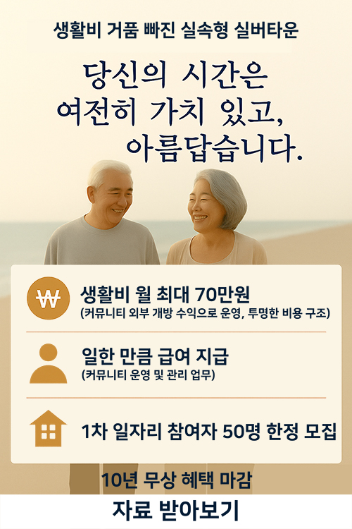 일하며 사는 인생 2막, 생활비 걱정없는 실버타운지금 시작하지 않으면 늦습니다. 일하며 사는 인생 2막, 생활비 걱정없는 실버타운지금 시작하지 않으면 늦습니다. 커뮤니티 운영으로 생활비 절감 일자리 제공 "생활비 70만원 실속형 안내서" 지금 바로받기 해운대, 최상의 생활 인프라 해운대, 최상의 생활 인프라 천혜의 자연 환경을 가진 해운대 자연의 건강함과 도시의 활기를 함께 누리는 곳